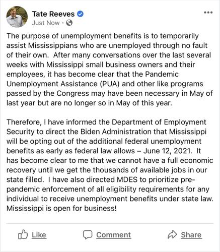 Mississippi Gov Tate Reeves To End Pandemic Linked Unemployment Payments State Government Djournal Com